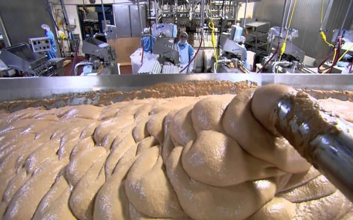 O vídeo mostra como são produzidas as salsichas que são usadas nos cachorros quentes.