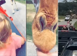 Enquanto alimentavam as girafas, a sua filha foi rapidamente levantada...