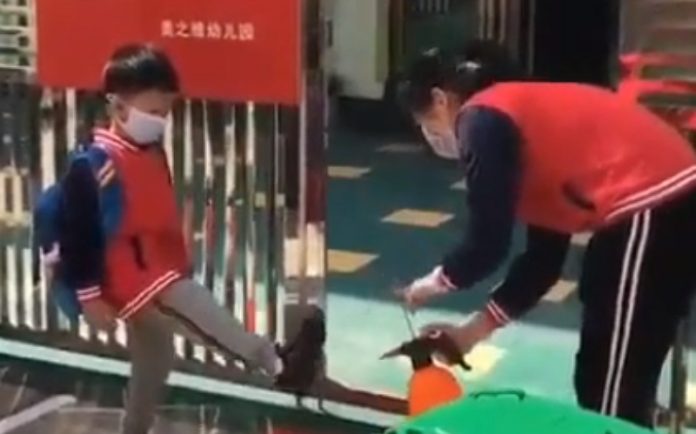 As crianças chinesas passam por um rigoroso protocolo de desinfecção antes de entrarem na escola para evitar o contágio e disseminação do novo coronavírus, causador da Covid-19.