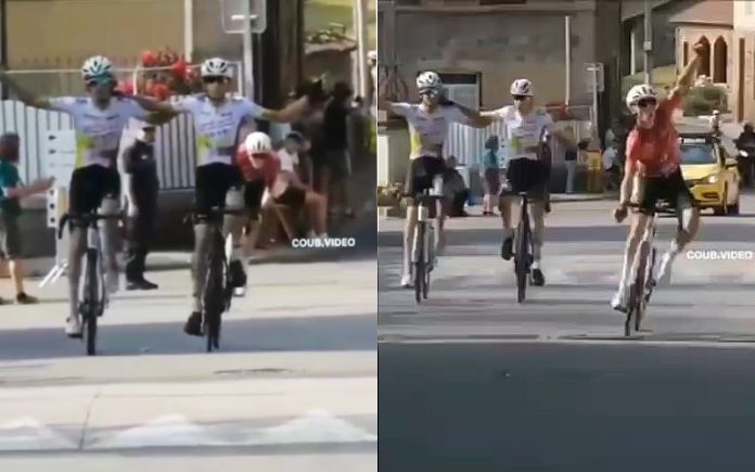 Numa corrida amadora em França, dois colegas de equipa, Rémi Arsac e Charly Merle, decidiram celebrar antecipadamente a vitória ao cruzarem a linha de chegada de mãos dadas.