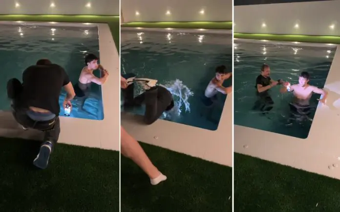 Num instante de descontração junto à piscina, o futebolista português João Félix diverte-se ao testemunhar um amigo sendo empurrado para a água.