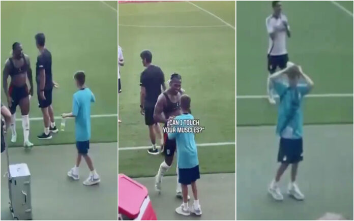 Jovem apanha-bolas fica impressionado ao tocar nos músculos de Adama Traoré
