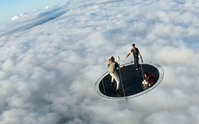 Um grupo de jovens elevaram a adrenalina a um novo patamar ao pendurar um trampolim num balão de ar quente para acrobacias acima das nuvens.