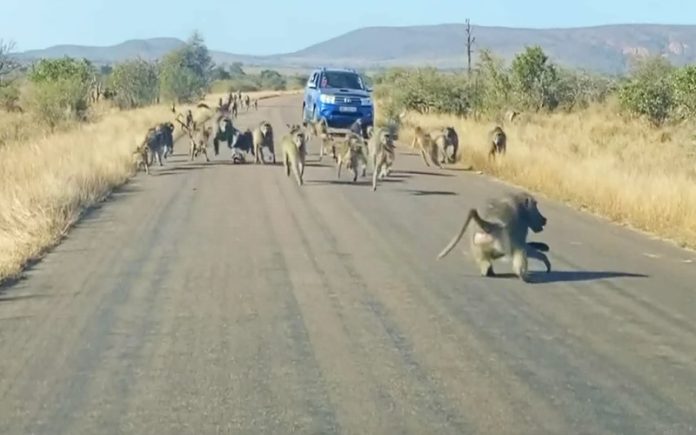 Um encontro surpreendente entre um leopardo e um grande grupo de babuínos foi capturado em vídeo, resultando em um momento impressionante.