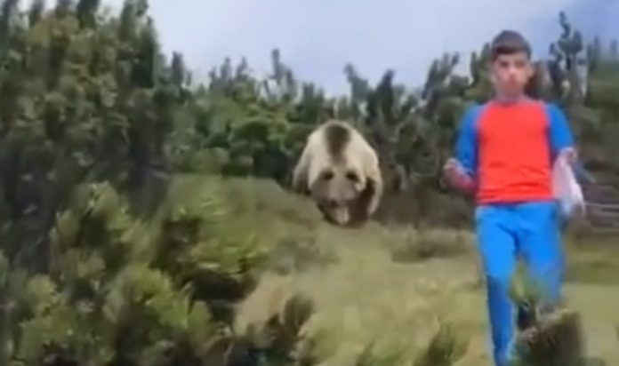 Este menino italiano apanhou um grande susto ao perceber que atrás de si vinha um urso de grande porte.