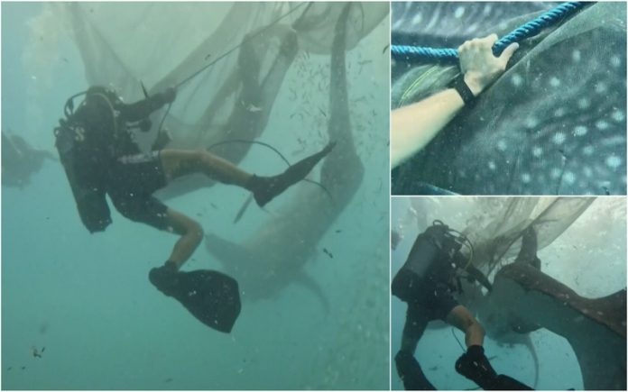Um grupo de mergulhadores corajosos resgatou cinco majestosos tubarões-baleia que estavam presos numa redes de pesca.