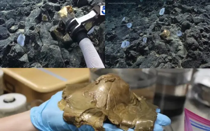 Investigadores da Exploração Oceânica da NOAA descobriram o organismo dourado com forma de esfera enquanto operavam um submarino controlado remotamente ao largo da costa do Alasca, Estados Unidos