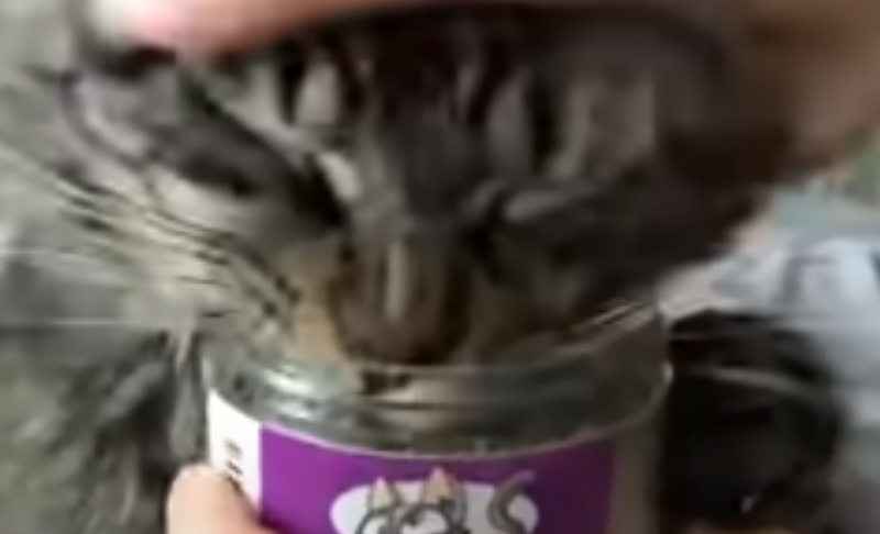 Mulher nao consegue tirar frasco de Catnip do seu gato
