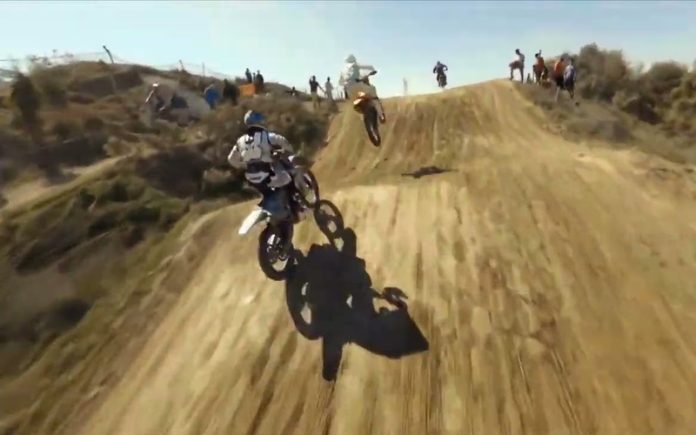 Um homem capturou imagens impressionantes de um drone enquanto os pilotos de motocross procuram vencer uma corrida cheia de emoção a toda a velocidade numa pista difícil.