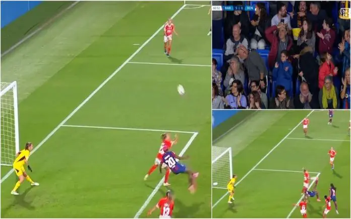 No jogo entre Barcelona e Benfica, a jogadora Oshoala brilhou ao marcar um golaço de pontapé de bicicleta, contribuindo para a vitória expressiva da equipa catalã.