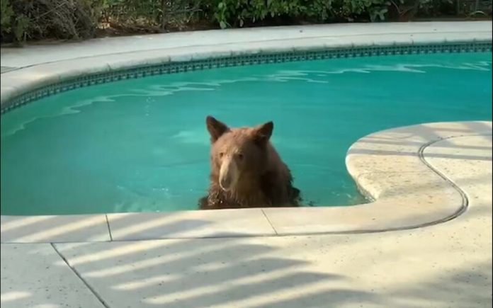 O vídeo mostra um grande urso preto a nadar alguns minutos na piscina.