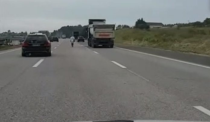 O homem seguia no meio das três faixas, colocando a sua própria vida em risco. Não aconteceu um verdadeiro desastre porque um dos condutores ajudou a servir de barreira.